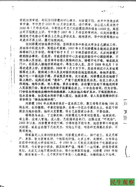 因为劳动纠纷,具有干部身份,会计师资格的刘彩霞,2008年4月14日被武汉市精神病医院鉴定为偏执性精神障碍,先后7次被武汉警方送到精神病院接受强制治疗。在“治疗”的过程中,刘彩霞患了严重的妇科疾病,她多次要求治疗,医院称没有这项经费,在家人一次次的努力下,她才离开那个让她生不如死的“魔窟”。
