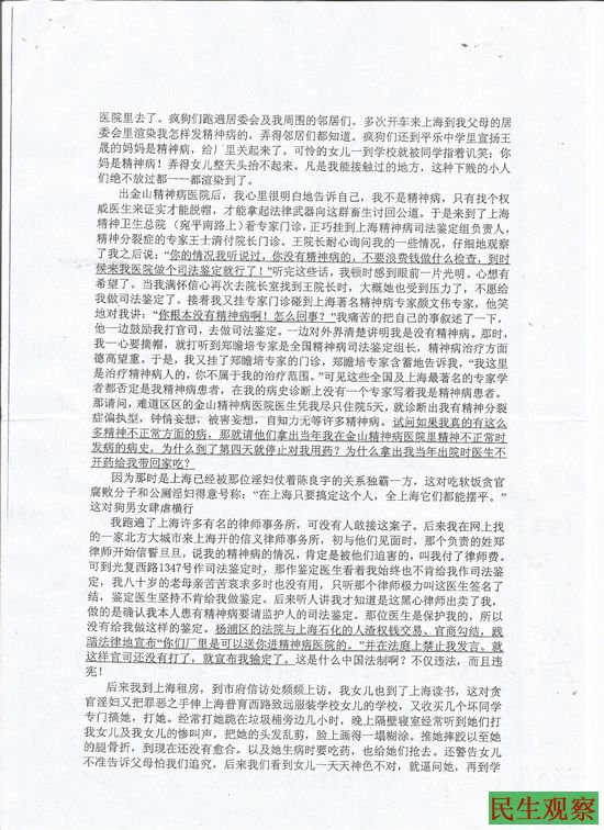 如今,徐建明经常带着她原本活泼漂亮的女儿进京上访,她寄希望于卫生部,每次进京都要到卫生部登记,她坚信依照《精神卫生法》的规定,她一个正常人没经过权威部门的鉴定就被关进精神病院强制治疗是违法的,她要依法讨还公道!