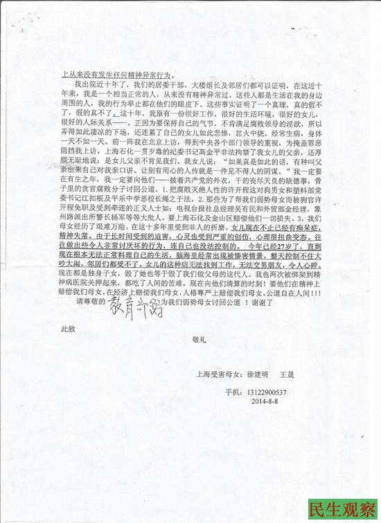 徐建明出院后,决定为自己和孩子讨还公道,她找到上海石化股份公司领导要求摘除精神病帽子,不要再伤害她的女儿。这位领导只淡淡的告诉她,送你去看病,这没错嘛。甚至还要让信访局查查她家祖上有没有神经病史。徐建明随后又找到了金山区区长,她把她没精神病的证据,邻居和同事的证言摆在区长面前,这位区长连看都没看就做了答复,“你自己没病的话,人家干吗把你送精神病院去,他们当领导的忙都忙不过来,你女儿要是好,这批学生干吗不打别的同学,就打你女儿”。