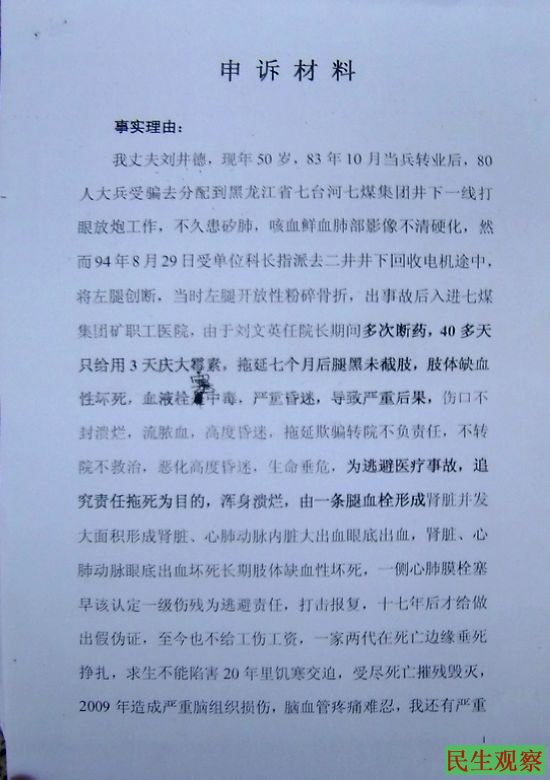 李小燕说“最让人气的是,我到省里上访,省里有人问他们为什么不给治病,并告诉他们我都到省里拦领导车了,可是省领导的提醒并没有给我解决问题,还被他们送进了看守所,后来我知道单位向上级报告我老公的医疗费用达80万之多,从1994年到2009年的14年里,没给我们治病,哪里来的那么多药费,他们没给我老公治病,但是他们向上级报了我老公治病的费用,每年几十万的额度,我就举报他们,结果把我儿子的工作也停了,儿子也是在七煤集团下属的煤矿工作。”