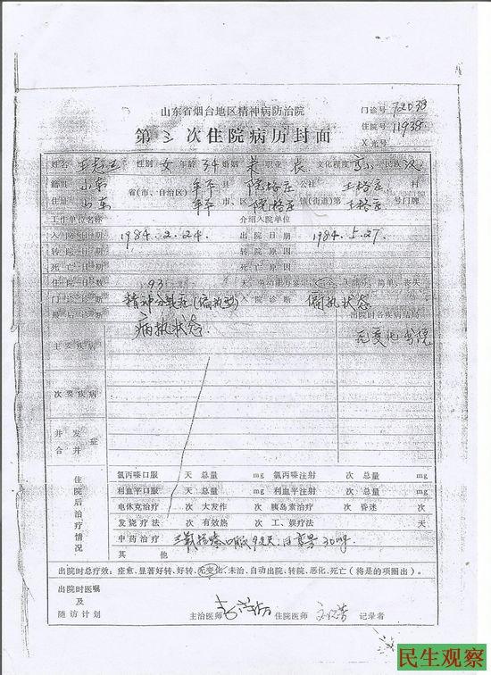 让人不解的是,在烟台地区精神病防治院王志兰出院记录上赫然写着,坚信受迫害,反复上访扰乱社会秩序15年,第五次入院。这真的很让人想不通,医院是救死扶伤的地方,即便是治疗精神病的医院也应本着治病救人的原则,可这家医院却干起了公检法的勾当,把上访人强制关押“治疗”。