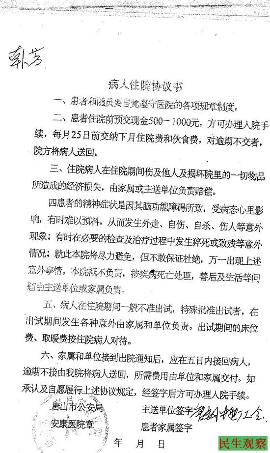 韩方:那是1993年底发生的事,我的工友郑金满上夜班时工伤死亡。在处理后事时,家属的合理要求厂方没答应,我就帮我工友的家属打抱不平,出面与厂方交涉。厂方还是不答应,我就开始罢工。厂里的工人也都为这事抱不平,口头委托我与厂方谈判。接待我的是副厂长兼工会主席齐国良,齐国良还是说不行。我就说“你不答应我就推翻你,我就想当厂长给工人谋福利,工人都听我的”。齐国良说我精神有问题,先让我回家,不用上班了,以后天天到厂里报到就行,过了几天 就把我送进了唐山市公安局安康医院精神科强制治疗了4个月。