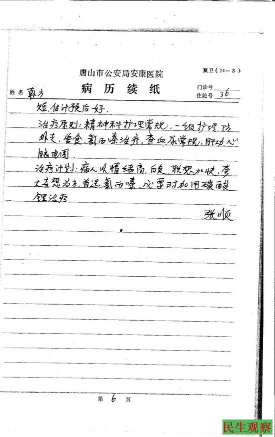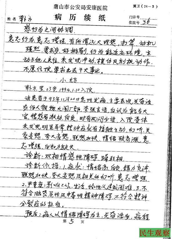 韩方:是1994年的1月10号把我送进医院的。我的工友郑金满从死亡到下葬也就20来天时间,他下葬后我找齐国良说的这话。齐国良就不让我上班了,让我天天到厂里报到就行。这样坚持了一个星期吧,1月10号我又到厂里找齐国良报到,他说让我到医院检查一下看我有没有病。公安处保卫科的胡贺秋、厂武装部的王凯胜用厂里的车把我送到唐钢医院精神科检查。梁尔文大夫问我有什么病,我说我没病,就是给厂里提意见,你没看有两杆枪押着,他们一个是保卫科,一个是武装部的。结果检查完就把我送到了唐山市公安局安康医院。