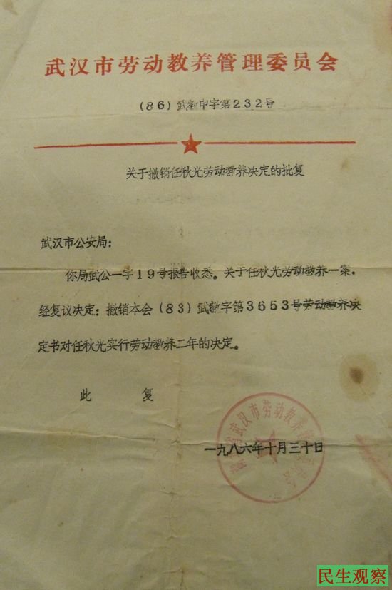 今年10月29日是任秋光满六十周岁的日子,当天他到武钢绿化公司办理正式退休手续时,却被告之早在十年前他的劳动关系就已被转到了“社保”,也就是十年前他就被武钢绿化公司“减员增效”掉了,早已不是武钢绿化公司的职工了,而这一切任秋光说没人告诉他,十年来他浑然不知。对此,任秋光感到异常愤怒,他指这是当局对民主人士的迫害。