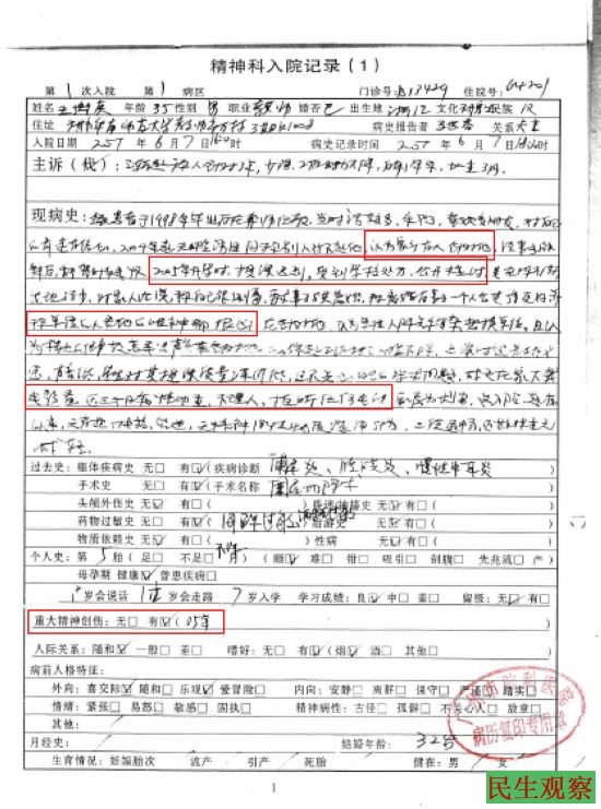 随后,他要我脱下鞋。我不知道是什么意思,就听他的。结果是让我进了一个铁笼子,有个护士叫我脱衣服、换上精神病医院的病服。我大吃一惊,怎么这么快,整个精神病签定,居然只有7分钟左右!吓得我几乎头昏地转,却也只有惊惊颤颤地乖乖听话。出院后才得知,医生给我的诊断是‘有精神病性症状的抑郁症’”。