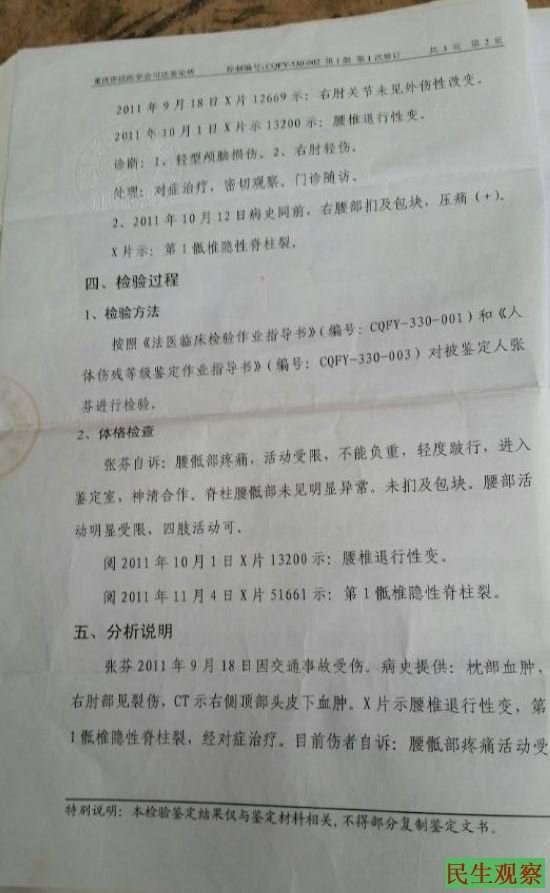 2011年9月18日的早上,张芬走在街上被风驰电掣而来的一辆摩托车撞倒,车主谢尤军并没有报警,只带张芬到医院做了简单的检查。心底厚道的张芬并没有多想,认为皮外伤过几天就好了,便自行回家。其后张芬连续多日腰痛难忍,到医院检查发现,她的骶椎隐性脊柱破裂。认识到事态的严重后,张芬忍着疼痛赶到合川区交通巡逻支队去报案,交警也做出了谢尤军对此交通事故负全责的事故认定书。