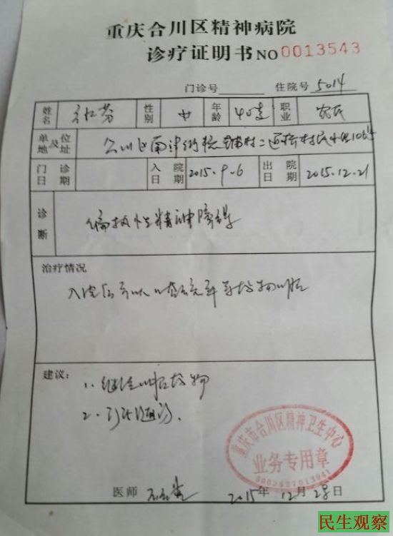 重庆上访农妇张芬两次被关精神病院 曾割腕抗争