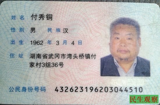 付秀铜,家住湖南省武冈市湾头桥镇付家村3组36号, 2001年在广州打工期间被广州公安铁路处3次违法收容虐待,后经复议机关认定公安铁路处对他的收容行为违法,因不满赔偿数额,付秀铜起诉到法院并逐级申诉至最高法,最终因为他的执着惹恼了政府被政府关进了精神病院。