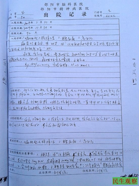 付秀铜说,在精神病院我被绑在床上打针,一天一次,输液一天3次,还吃口服药,也是一天3次,用了药后我走路都摔跤,浑身不舒服。关了3个月后过了国庆节他们还不让我出去我就闹,因为当时送我来时说是过了国庆就让我走,医生说没人接不让走,别人接也不行就得谁送谁接。我一直闹医院通知了镇政府,到93天的时候政府来人才把我接走。但是在医院的治疗给我留下了后遗症,出来这么长时间了现在我脑子还是不清楚,走路不稳,浑身疼,完全丧失了劳动能力,他们为了不让我上访用药把我治坏了,还把我鉴定成偏执性人格障碍。