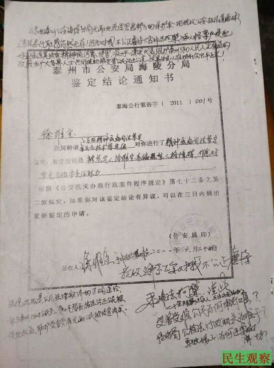 江苏泰州徐维宝投诉警方 被强做精神病鉴定 |