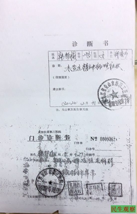 经韩敬元多次索要,最终派出所给了他韩帮梅的两次诊断结果,黑龙江省第三医院出具的门诊诊断结果是“未见精神异常”。12月31日,尖山农场医院出具的诊断书中诊断结果是“未查出精神病性症状”。