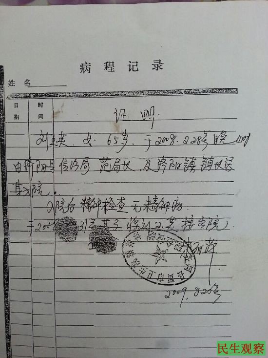 到医院大夫很爽快的就把她收下,也没给她检查就关进病房,直到3月15日送她去的人才把她接出来。这期间她家人并不知情。刘玉英说,“这是个私人医院,就是朱小萍和刘军他两口子开的,好在他们有点人性,没给我用药”。在刘玉英的儿子马平怀的央求下,2008年8月5日朱小萍开具了一份刘玉英曾经住院的证明。