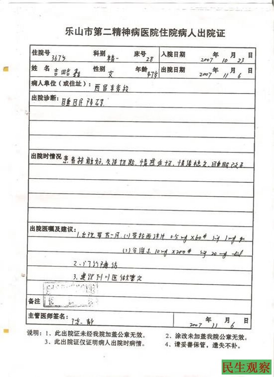 吉略鑫说,在病房医生和押送我来的人员不顾我的反抗把我绑在病床上就给我灌药。给我灌完药之后书记戴勇等人就开始搜我的身,戴勇边搜边问医生护士,“她现在还清醒吗”然后我的身份证、驾驶证、工作证、照相机、钱包等全部随身物品被拿走。就这样绑了我两天两夜,每天给我灌3次药,放开我后还是给我灌药,就这样折磨了我15天。出来那天是11月6日,那天上午好多专家和医生查房,我说了我的情况,他们就通知了西昌车务段来接我的。