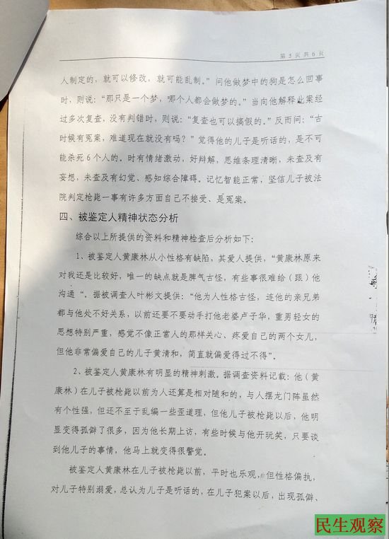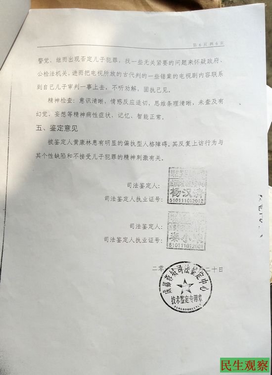 2011年11月20日,成都蓉城司法鉴定中心出具的司法鉴定意见书中载明,委托给黄康林做精神疾病鉴定的是仁寿县新店乡人民政府,鉴定意见为,黄康林患有明显的偏执性人格障碍,其反复上访与个性缺陷和不接受儿子犯罪的精神刺激有关。该鉴定书中还载明,2007年10月2日,华西医院司法精神鉴定时所作精神科检查,未发现精神病性症状。2008年成都蓉城司法鉴定中心也曾给他做精神鉴定,鉴定后黄康林被劳动教养,但至今未给他鉴定结果。