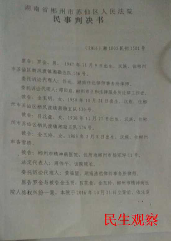 2016年小罗请律师向郴州市苏仙区法院提起诉讼,将家人及郴州市精神病院诉至法院。