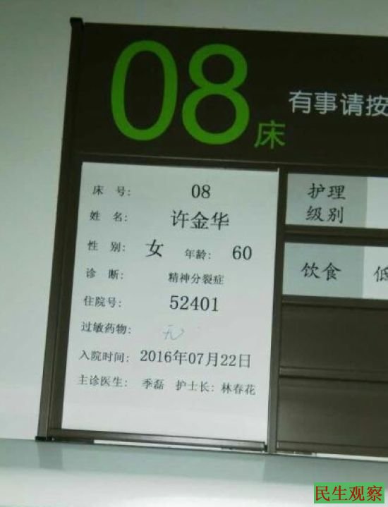 许金华床头上的排号上标着不知道谁鉴定的“精神分裂症”
