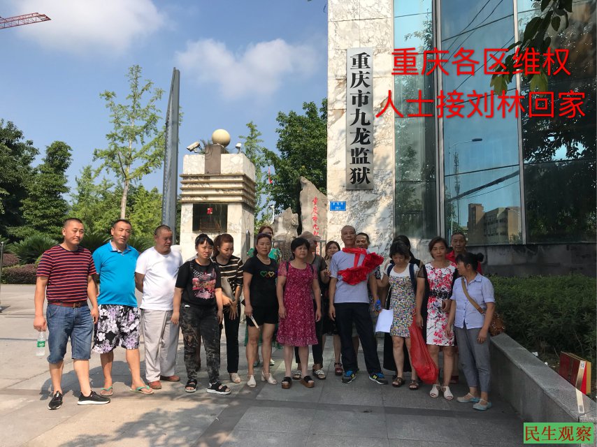 7月13日上午9点30分左右,重庆市各区维权人士何艳、郭兴梅、赵安秀、危文元、肖建芳、李群等数十人陆续抵达重庆九龙监狱门口,在此迎接即将刑满释放的重庆维权英雄刘林回家。9点56分,刘林在一名警察的陪同下走出监狱大门,大家激动地热烈鼓掌,同时献上早已准备好的红花,欢迎英雄归来。刘林看起来瘦了好几大圈,但精神很好,众人感叹三年的牢狱生涯依然难以磨灭他的硬汉气质。