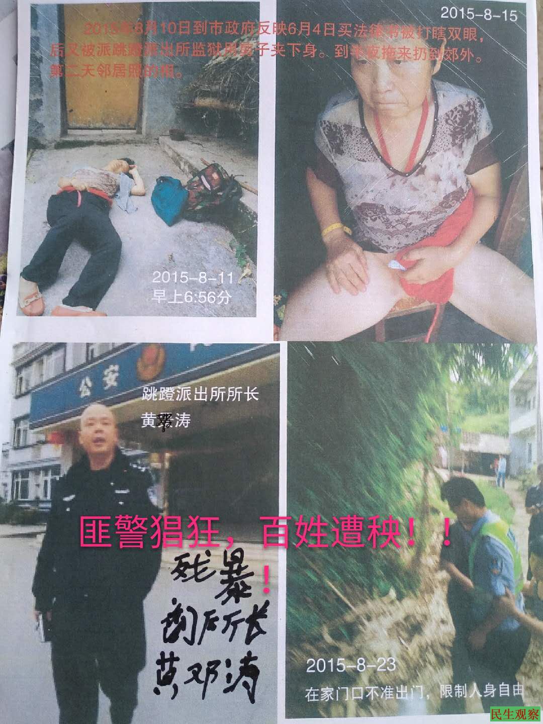 2015年8月10,村民李光之扶伍永芳去重庆市政府反应问题,刚下车伍永芳就被跳蹬派出所警察再次绑架,后被拖到所里被固定在审讯椅上,被警察用剪子剪下身,伍永芳当时疼的晕死过去,到了后半夜她被拖出派出所扔在外面。
