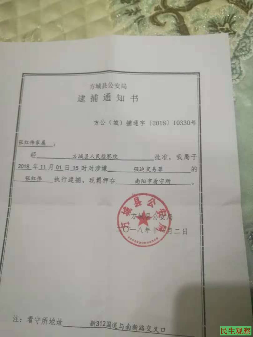 拦截董事长车的断友们被北京西城分局行政拘留五日,拘留期满后几位断友相继被释放,唯独河南张红伟被当地政府与银行单位接回去,在2018年10月17日再次被以涉嫌敲诈勒索罪刑事拘留关押在河南南阳看守所,在11月2号家属收到张红伟被逮埔的通知书,构陷罪名由涉嫌敲诈勒索罪改为强迫交易罪。