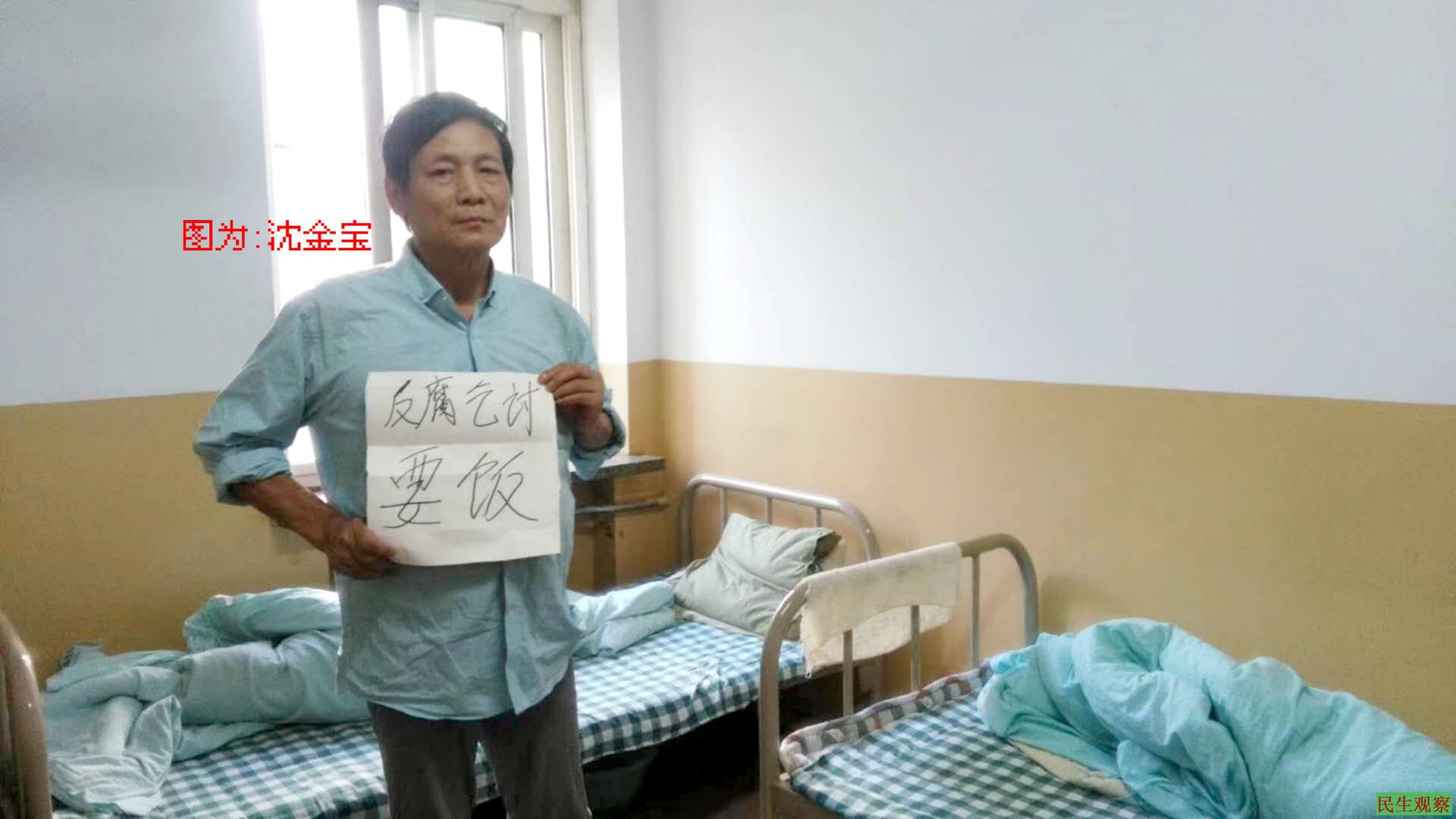 2015年1月8日,沈金宝的儿子沈佳君在小区购买香烟时,因买到了假烟和店主发生了口角,后被浦东新区公安分局关押在浦东新区看守所51天,其后又在父母不知情的情况下把沈佳君关进强制医疗所“被精神病”治疗。在此期间,地方政府以其子为人质,胁迫沈金宝签署一份不平等协议,并称会将沈金宝的养老金一同解决。但此后政府并未履约,导致沈金宝无法养老,生活窘迫。2017年6月17日,沈金宝开始到北京乞讨为生。