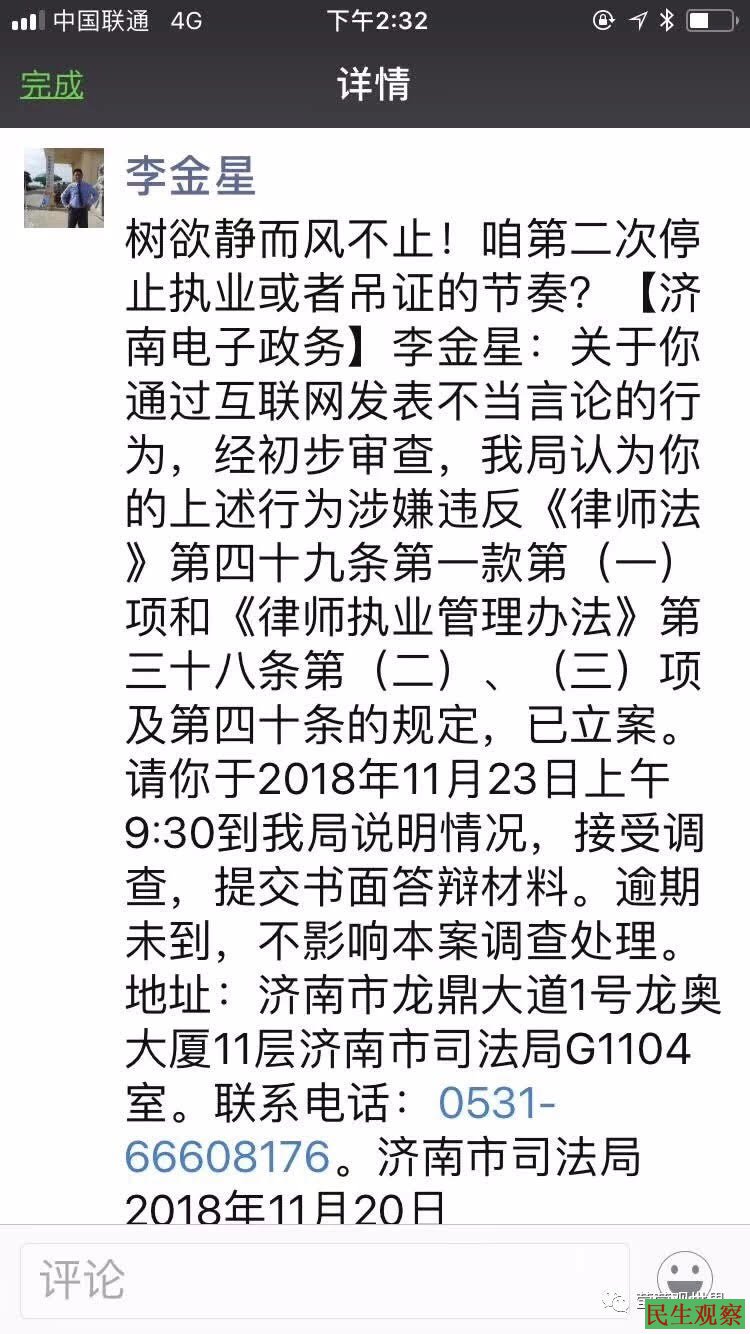 2018年11月20日,李金星律师通过微信朋友圈发出消息称:“树欲静而风不止!咱第二次停止执业或者吊证的节奏?11月20号收到【济南电子政务】李金星:关于你通过互联网发表不当言论的行为,经初步审查,我局认为你的上述行为涉嫌违反《律师法》第四十九条第一款第(一)项和《律师执业管理办法》第三十八条第(二)、(三)项及第四十条的规定,已立案。请你于2018年11月23日上午9:30到我局说明情况,接受调查,提交书面答辩材料。逾期未到,不影响本案调查处理。地址:济南市龙鼎大道1号龙奥大厦11层济南司法局G1104室。联系电话:0531-66608176济南市司法局2018年11月20日”。