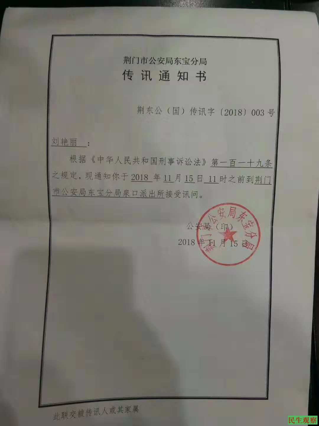 据悉,2018年11月20日下午,湖北荆门市东宝公安局国保王春生、王锐到荆门建行刘艳丽上班办公室出示传唤书,要求刘艳丽第二天即21日上午8点30分到东宝区公安局谈话,下午5点刘艳丽打电话给王春生说想当天下午5点去东宝区公安局,王春生不同意,要求她21日上午去。21日上午刘艳丽去荆门市东宝区公安局之后既没有回家也没回单位,公安局也没有与家属联系,现已与家人失联长达32小时。