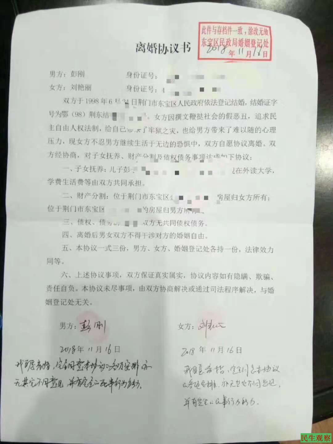 2018年11月15日刘艳丽也曾被荆门警方传唤,第二天即11月16日刘艳丽与丈夫彭刚协议离婚。刘艳丽自述,因撰文鞭挞社会的假恶丑,追求民主自由人权法制,给自己带来了牢狱之灾,也给家人带来了难以抹掉的心理压力,现本人不忍家人继续生活在无边的恐惧中,双方自愿协议离婚。