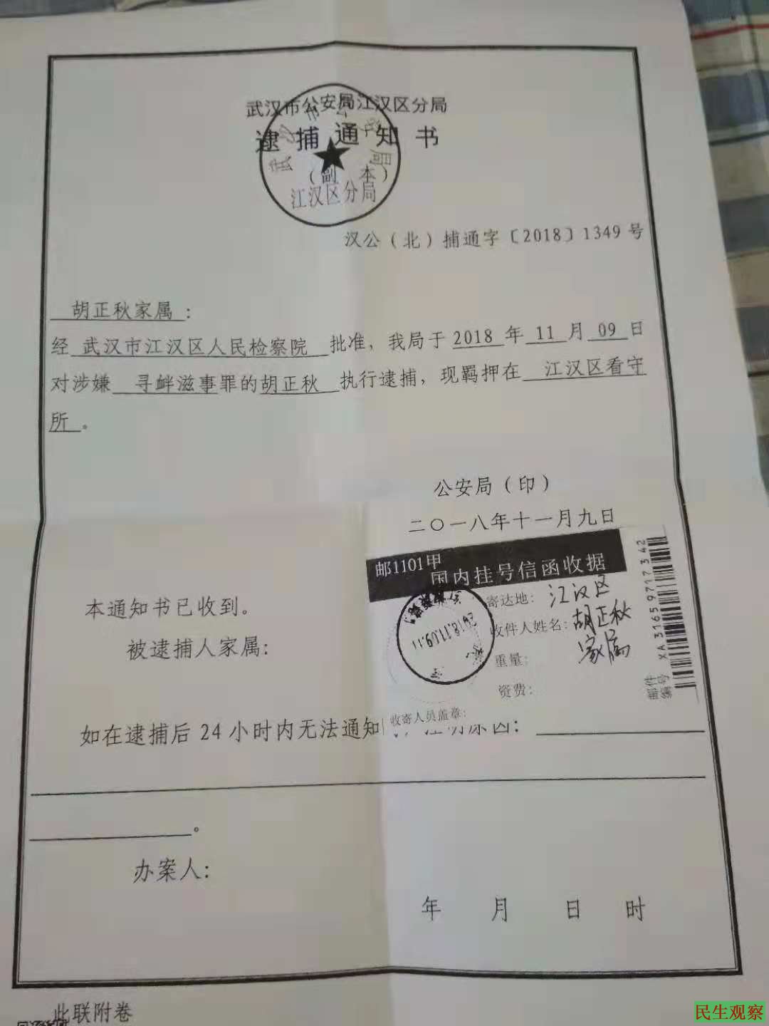 同是访友的山东淄博张凤英说,今年10月底胡正秋因进京上访被带回武汉刑拘,警方只是口头通知家属胡正秋被刑拘了,并未出具书面的法律手续。期间,胡正秋家人多次前往北湖派出所询问其情况,均无任何结果。11月27日当胡正秋家人再次前往该派出所询问时,办案警察拿出一张逮捕通知书的复印件,告知胡正秋已于11月9日被武汉市江汉区检察院批捕了。