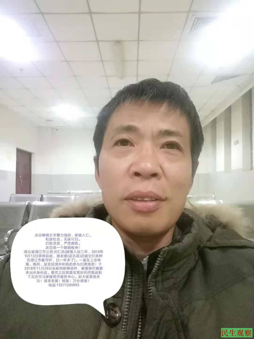 【民生观察2018年11月29日消息】本网消息,湖北潜江访民帅仁兵与梁志英夫妇是因强拆被逼上访多年。帅仁兵曾经在2015年9月4号大阅兵时在天安门被警察拦截送马家楼,被当地政府截访带回后被行政拘留10天后转刑事拘留后转送潜江看守所关押,随后被潜江公安局依敲诈勒索罪逮捕,被潜江当局构陷以敲诈勒索罪判刑三年。
