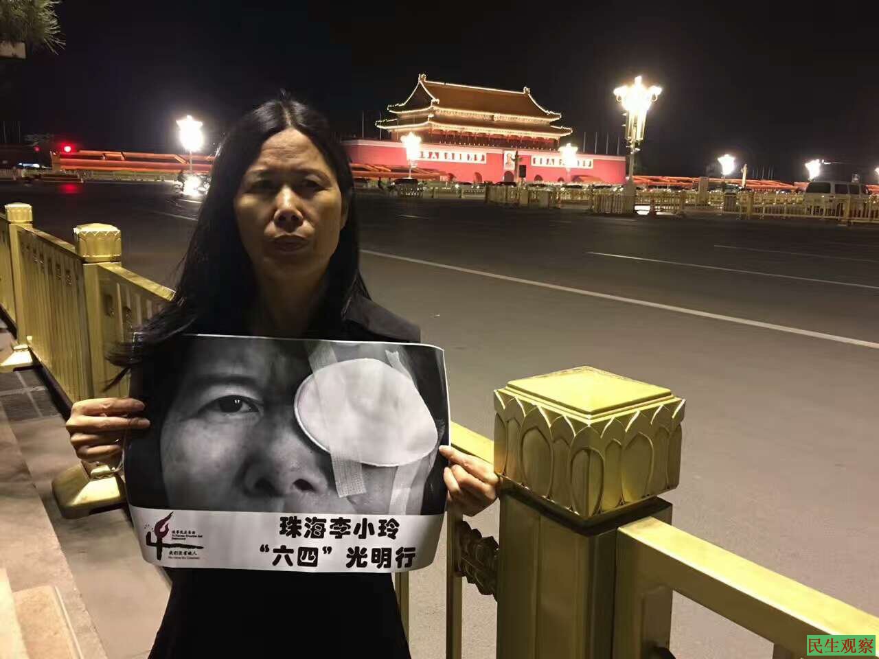 2017年6月2日,李小玲在好友的陪同下去到北京准备寻求名医帮助及治疗。6月3日,李小玲发起“六四光明行”行动,得到广泛关注和支持。6月4日凌晨,李小玲在友人家中被捕,同时被捕的还有不同地址的多位好友,被捕人数总共9位,羁押北京西城区看守所。7月5日,涉案8人被以取保释放,李小玲被广东警方接走送回珠海,非法禁锢在黑监狱小宾馆,24小时派人贴身看管。7月15日,李小玲趁看管人员不备逃离黑监狱,并辗转多地于7月底抵达北京西站,被一早等候的珠海警方强行带走,8月1日遭刑拘十天,8月8日,李小玲被珠海警方刑事拘留,9月12日,李小玲被批准逮捕。2018年5月,当局通知辩护律师指李小玲案将于6月8日开庭审理,其后开庭取消。2018年12月3日,李小玲被以取保候审方式获得释放,累计超期羁押一年半。羁押期间,李小玲双眼得不到治疗,看守所拒绝为李小玲提供中山眼科中心开出的处方眼药水,仅以普通眼药水搪塞敷衍。同时,李小玲腹部肿瘤出现疼痛症状,李小玲多次要求治疗不果,辩护律师多次向珠海警方提出取保候审治疗申请,但均遭拒绝。