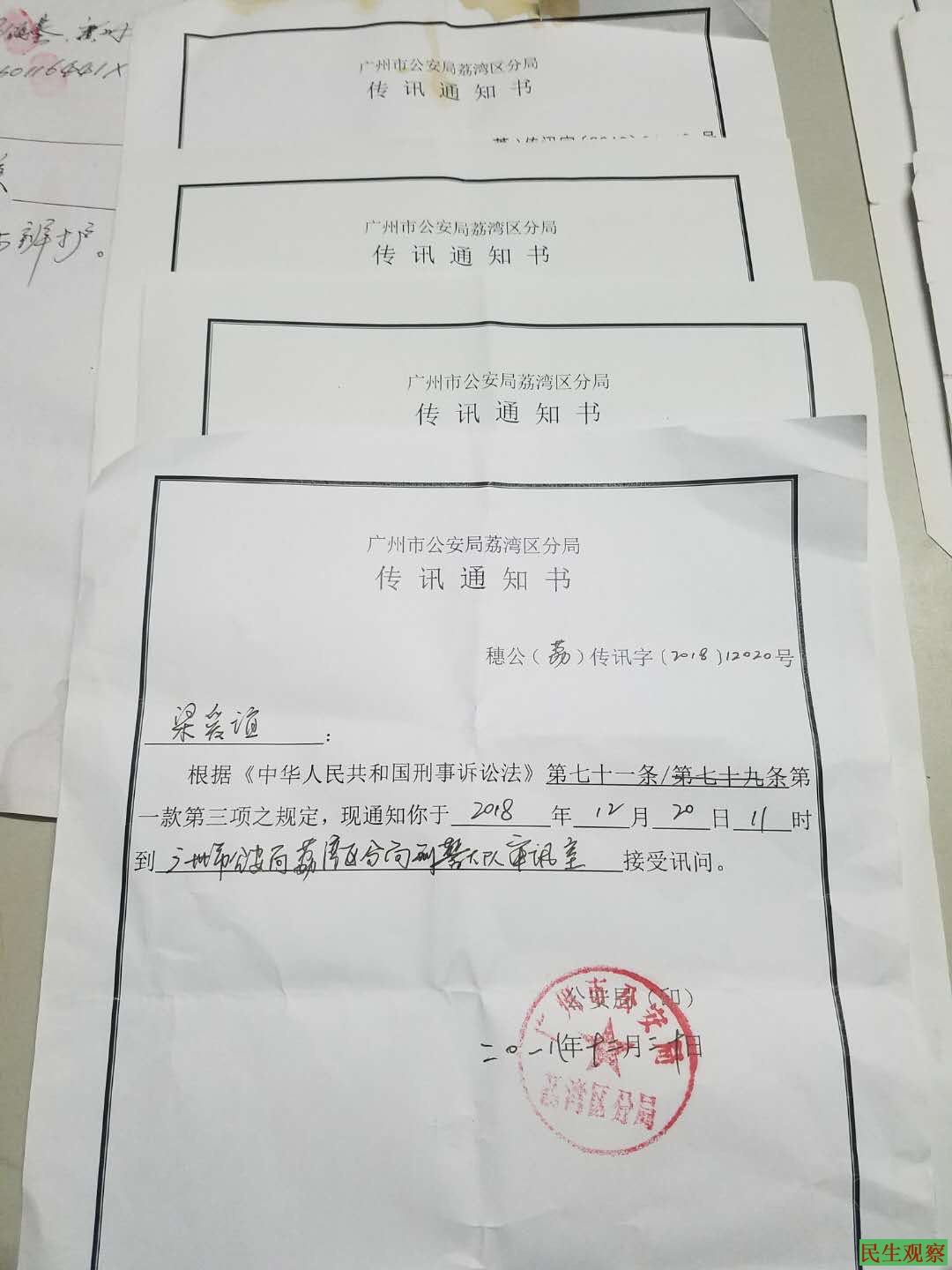 【民生观察2018年12月21日消息】“9.20”孙世华被构陷袭警案发生已有三个月,现场目击证人之一的梁颂基被控以“寻衅滋事罪”刑事拘留已接近三个月,与案件毫无关联的梁颂基远房堂妹梁一鸣因发布相关消息而被广州荔湾区警方频繁传唤及骚扰,期间抄走多部手机。