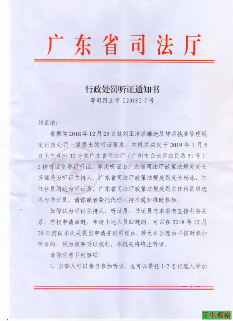【民生观察2018年12月27日消息】日前,广州知名人权律师刘正清收到广东司法当局信函,指其在执业过程中有严重违法行为,按照相关规定对其作出吊销律师证的行政处罚,刘正清律师已提出申辩,行政处罚听证会将于2019年1月9日举行。刘正清律师本人暂未公开对吊证事件发表看法。