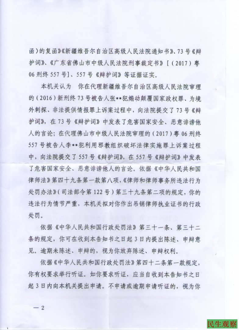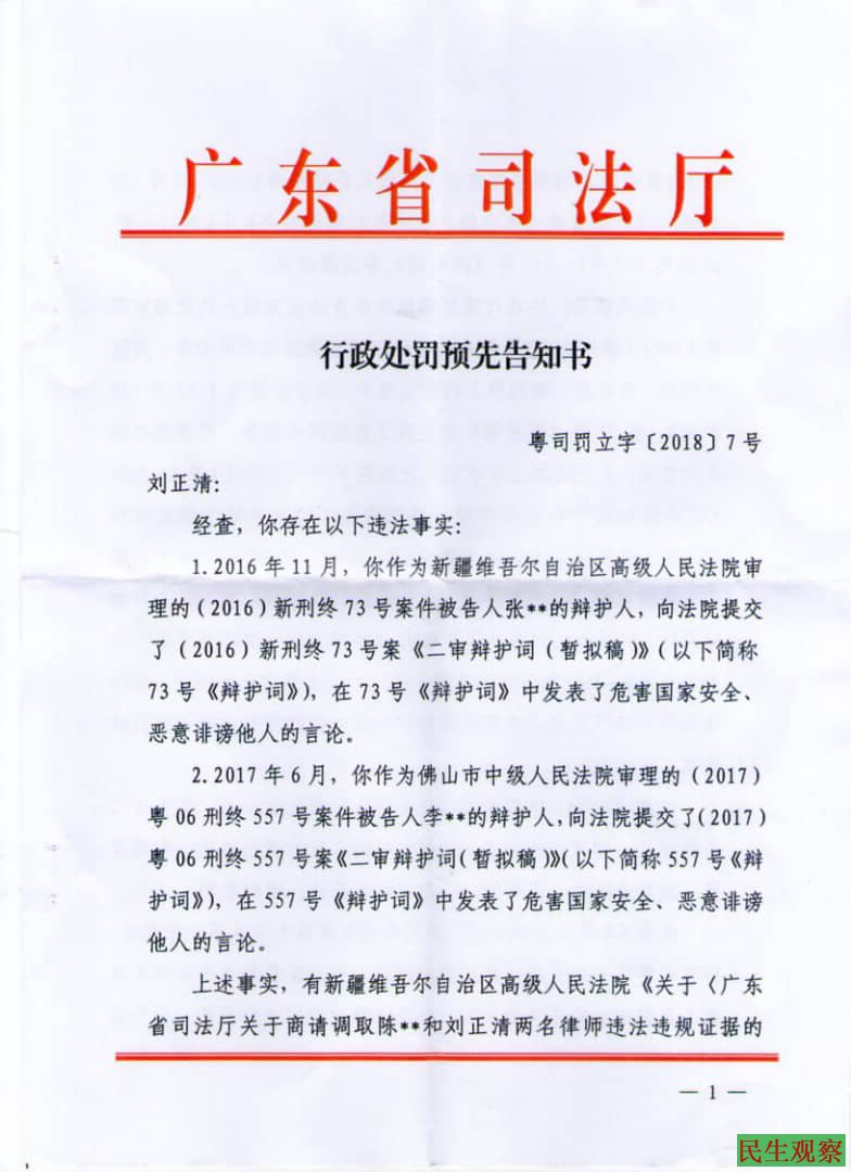广东省司法厅在《行政处罚预先告知书》中指出,刘正清律师有两次分别在不同的代理案件二审庭审时提交的《二审辩护词》中发表了“危害国家安全”及“恶意诽谤他人”的言论。两起案件分别是新疆高院审理的张某某触犯”煽动颠覆国家政权罪”和”为境外刺探、非法提供情报罪”案以及广东佛山李某某触犯”利用邪教组织破坏法律实施罪”案的上述过程中,刘正清律师向法院所提交的《二审辩护词》中发表了”危害国家安全”和“恶意诽谤他人”的言论,当局认为刘正清律师“违法行为情节严重”,因此根据相关规定拟对刘正清律师作出吊销律师执业证书的行政处罚决定。
