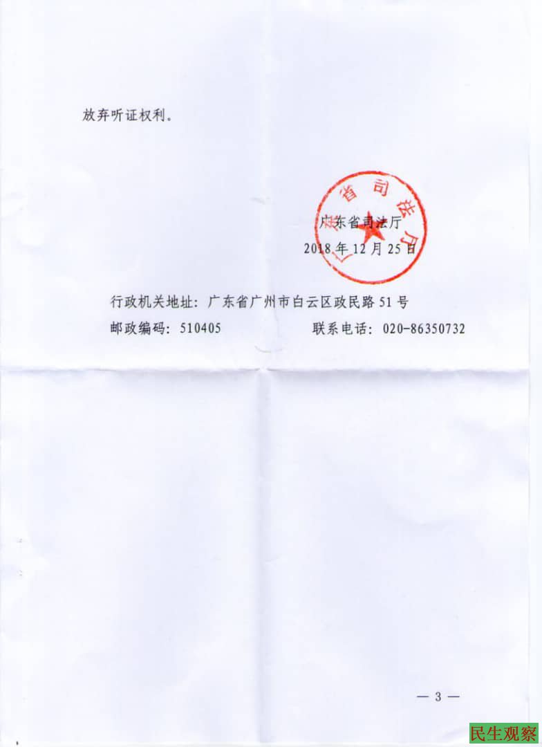 刘正清律师在收到广东省司法厅的吊证告知书后,马上向司法厅提出了听证要求,表示需要进行陈述和申辩。广东省司法厅随即作出听证安排,定于2019年1月5日(周六)上午9点30分在广东省司法厅二楼听证室举行听证会,司法厅政策法规处处长等人员担任主持人、听证员、书记员等听证现场工作人员。