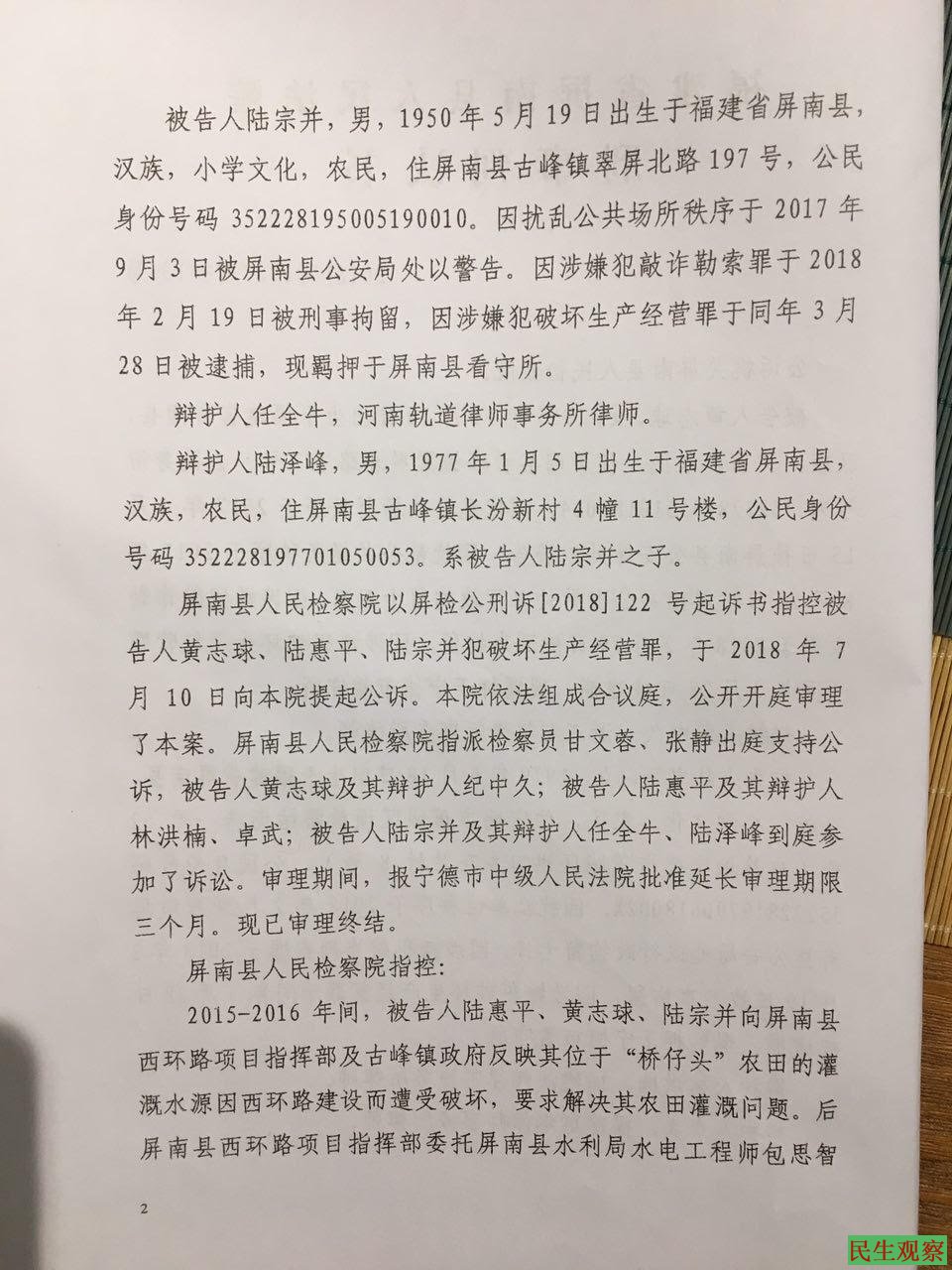 【民生观察2018年12月29日消息】福建屏南县陆惠平一家因土地维权而被地方政府以“破坏生产经营罪”打击报复,日前该案进行宣判,陆惠平一家获重判,该案于8月16日开庭审理。
