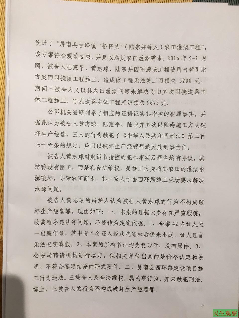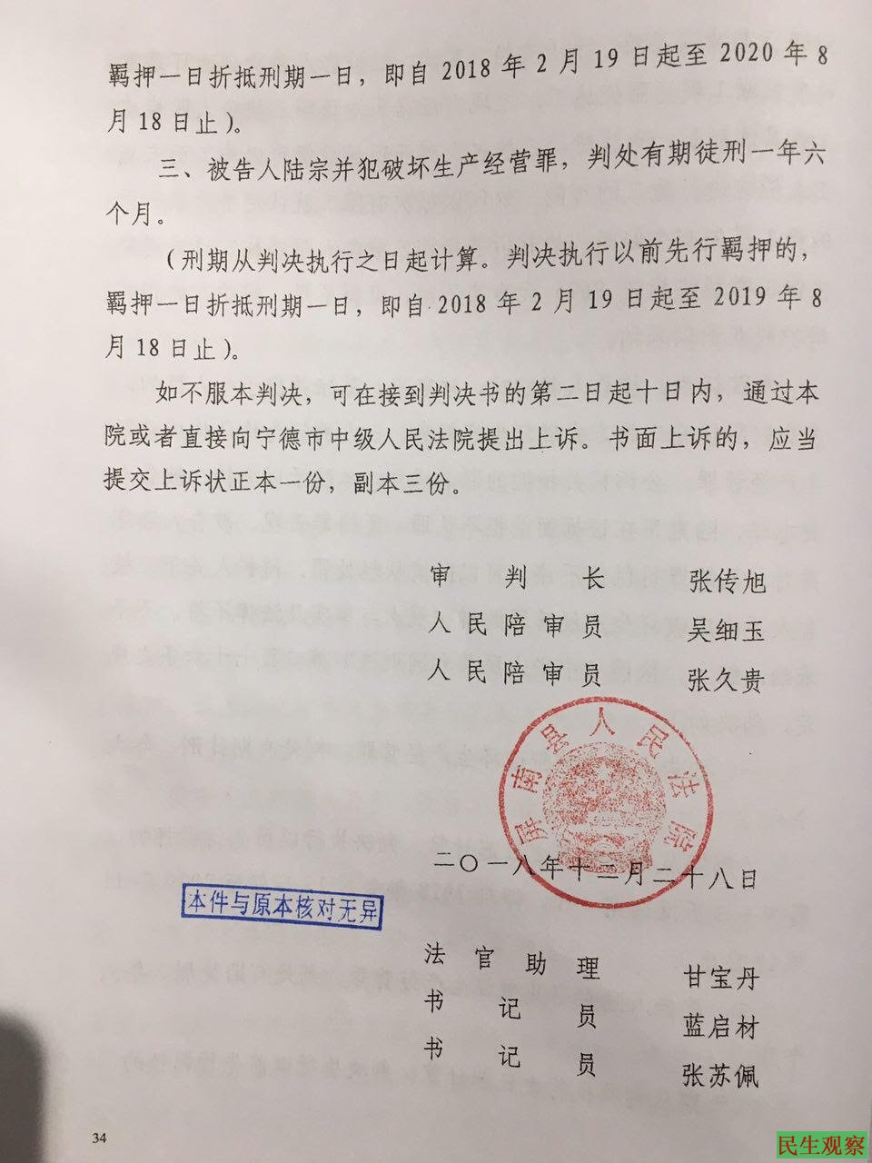 据该案辩护人林洪楠律师透露,28日下午三点,该案在屏南县法院宣判,当时三名被告人只有陆宗并一人出现在法院现场,其余两位陆惠平和黄志球未出庭。林律师向法院提出被告人未出庭的情况下不能宣判的事实,但审判长回应称“已为陆惠平和黄志球安排了远程宣判”,最后审判长匆忙宣读判决书后宣告结束。林洪楠律师面对如此荒唐扭曲的枉法裁判在判决书送达书上愤然写下十六字:左得可怕,右得荒唐,枉法裁判,必遭天谴。