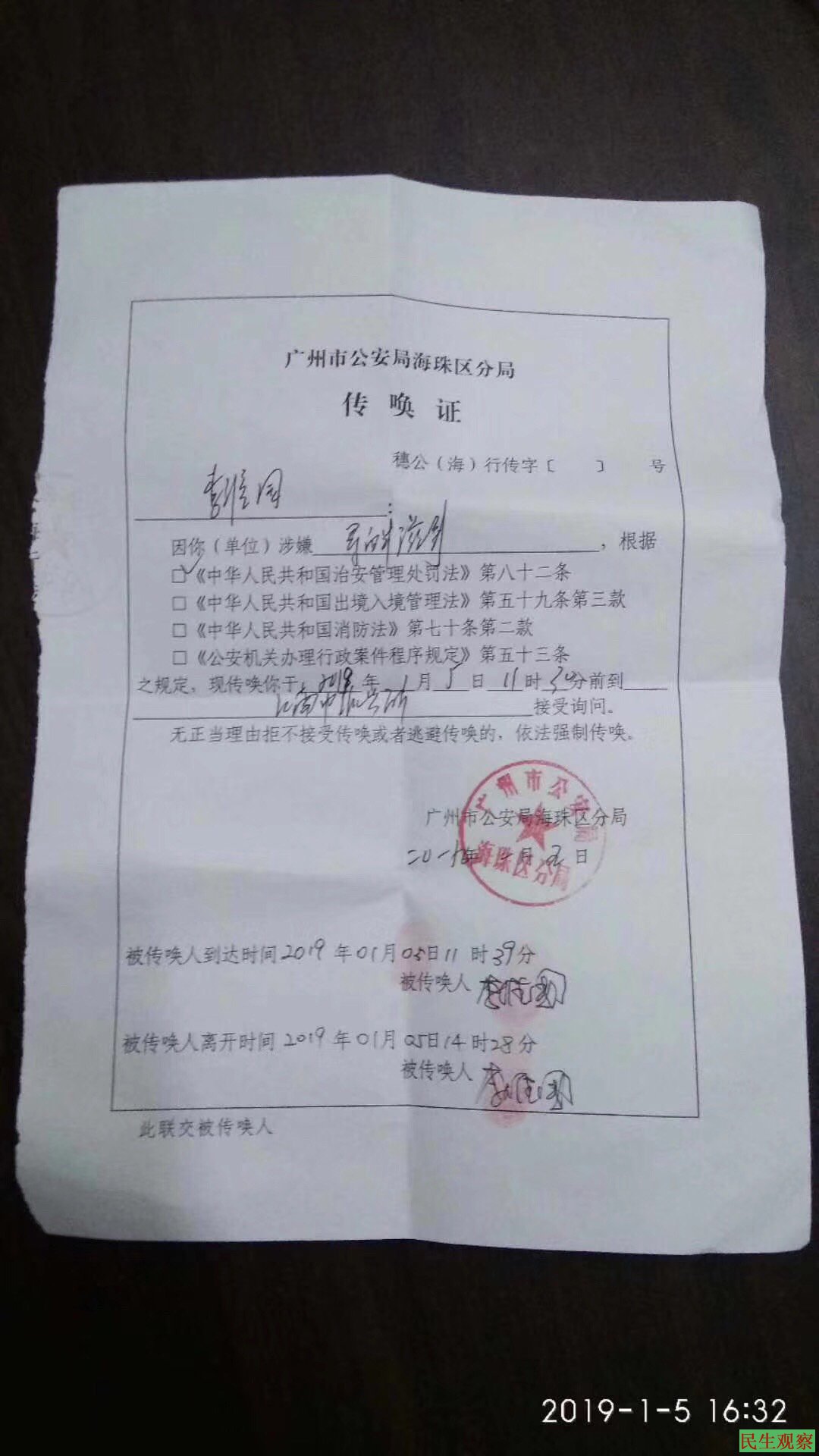 听证会并未因当事人未出席而停止或延后,但前去准备参与旁听的公民朋友却遭到警方的强行抓捕,以“寻衅滋事罪”的名义进行强制传唤。