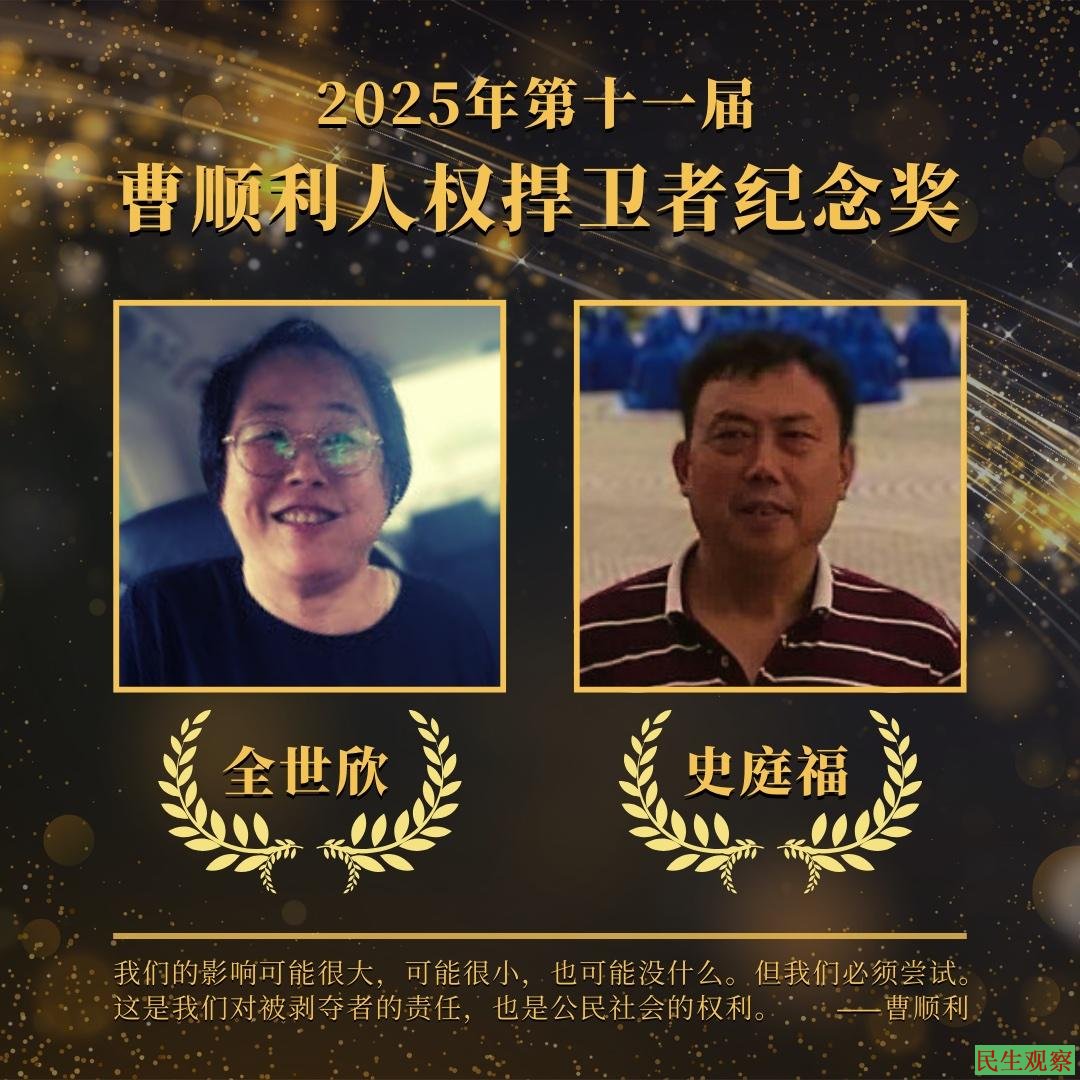 全世欣、史庭福荣获2025年“曹顺利人权捍卫者纪念奖” |