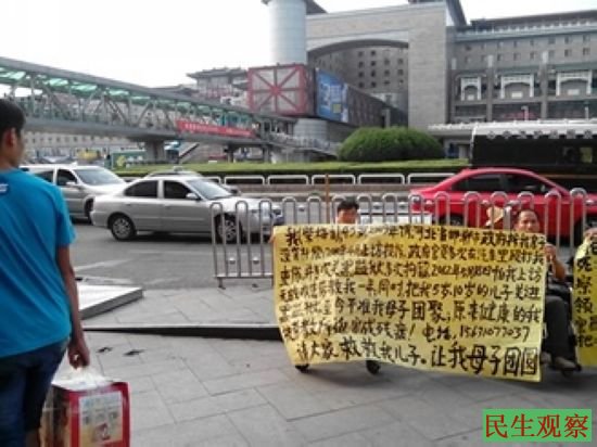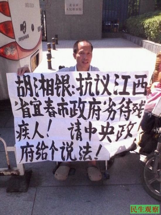 民生观察工作室2013-8-2消息:今天上午多名维权人士胡湘银、李会珍、郭万瑞、左凤娥、邹汝圣、殷冬根、肖青山等人,在北京西站等多处举牌抗议,要求江西宜春市委书记谢亦森,市长蒋斌下台。据悉,事件起因是由于江西省宜春市国土局地质队违规摆放变压器,导致该市市民胡湘银先生的双手严重受伤且致其终身残废,虽经多方投诉,政府部门却依然不予理会,不予以解决。另外,北京访民葛志慧,因被贪官勾结开发商非法强拆了她的房子,她去上访之时,又被开发商雇黑社会人员将其殴打致残,葛志慧8岁儿子(孙浩)也被北京市丰台区公安局关进黑监狱6天,葛志慧女士求告无门,今天也与肖青山先生他们一起,到了北京检察院等多地抗议。