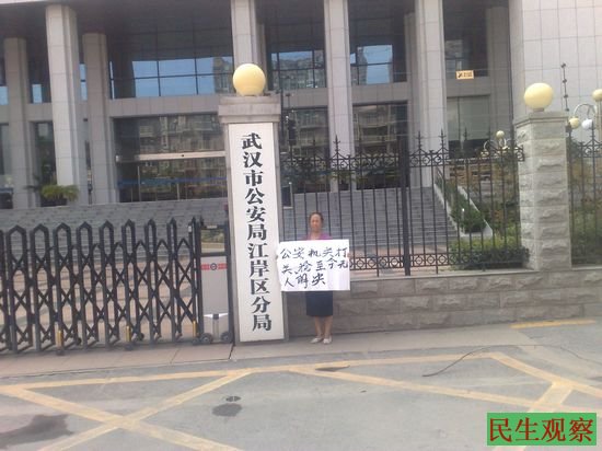 民生观察工作室2013-8-20消息:今天上午,武汉访民、被精神病者胡国红的妻子程雪来到武汉市公安局江岸区分局举牌抗议公安机关打、关、抢。