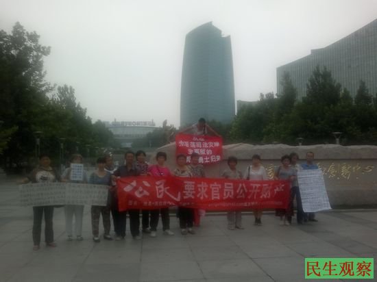 民生观察工作室2013-8-27消息:今天上午11点,来自全国各地的在北京的十八位访民,在北京高等学府和高科技及商业繁华之地的海淀区中关村广场,拉开《公民 要求官员公开财产》的横幅,要求习近平执政当局反腐,从官员公开财产开始。