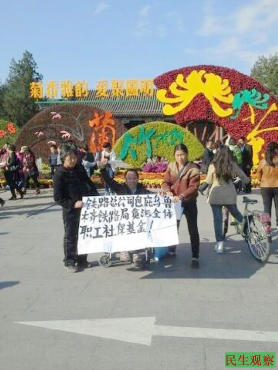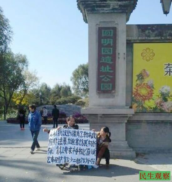 民生观察工作室2013-10-21消息:新疆公民杨新梅由于多年维权而被新疆库尔勒市政府和乌鲁木齐铁路局多次迫害。昨天下午,杨新梅和维权人士肖青山、冉崇碧等人一起来到游客云集的北京著名旅游景点园明园遗址公园门前,打出条幅表达抗议。他们抗议新疆库尔勒市政府非法暴力迫害访民杨新梅,并且要求库尔勒市委书记薛斌公布财产。