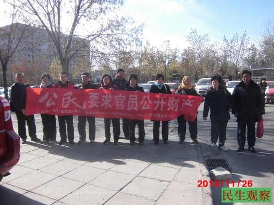 民生观察工作室2013-11-26消息:在京访民蔡志国、居小玲等人今天顶着北京3-5级的大风,在北京丰台区多处到处打横幅,他们还把横幅打到丰台区法院门口。横幅上写有“访民拥护司法独立要求纠正冤假错案”,“公民要求官员财产公开”,“官员财产不公开就是袒护腐败包庇罪犯”.