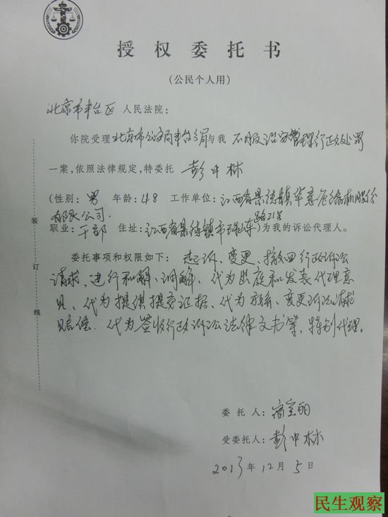 2013年12月5日下午3点30分,应丰台区法院行政法庭法官通知,宿宝丽和代理人到丰台区法院谈话、做谈话笔录,以确定行政诉讼案由和诉讼请求。宿宝丽当场向法院递交了授权彭中林作为代理人的授权委托书。