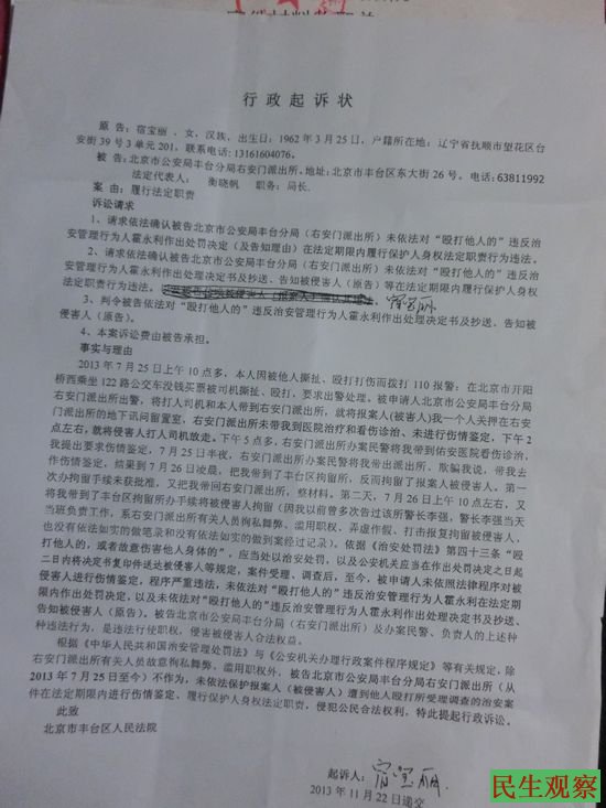 7月25日宿宝丽在南站附近开阳桥西乘坐北京公交122路车到国家信访局控告申诉,因一元钱没钱买车票而被司机冲出驾驶室拉扯、殴打后,宿宝丽打110报警,北京市公安局丰台分局右安门派出所反而将报案人(即被侵害人)宿宝丽行政拘留5日,将“殴打他人”的司机当时在派出所就放走,违反法定程序和法定职责,不处理。11月22日,宿宝丽在维权人士彭中林的帮助下,向北京丰台区法院递交了起诉状,状告北京市公安局丰台分局不履行法定职责一案,于昨日得到丰台区法院受理,交付了五十元诉讼费。