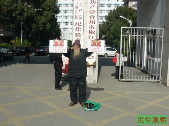 台州经租房维权群体后转到台州椒江区委、区政府门举牌 “钓鱼島是中国的、经租房是我们的合法房产、维护人权、维护财产权、维护做人尊严!”“依宪治国、依法执政、香港、澳门百年耻辱终于回归!经租房何时回归?还我人权、还我财产权、还我尊严!”展示维护人权,维护正义的决心!