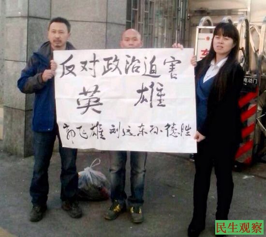 民生观察2013-12-24消息:今天,本工作室收到了郭飞雄的代理律师隋牧青发来的消息称,昨天下午,谢文飞、艾乌、杨崇等曾经在2013年参与南方街头民主运动的多位网友来到了广州市天河区看守所,他们在看守所门前举牌声援因为参与2013年初“声援南方周末事件”而被捕的刘远东、郭飞雄、孙德胜等民主人士!他们勇敢的站在该看守所门前,手举着“反对政治迫害英雄郭飞雄、刘远东、孙德胜”的标语牌,向广州当局表示抗议,并向社会宣传这些英雄们的英勇事迹。据在现场的广州网友贾榀说:2013年对于中国的民主事业来说是很有意义的一个年头。这一年,很多网友从网络走到现实中,走上了街头,用最直接的方式宣传自由民主,抗议当局的贪污腐败独裁专制。从年初到现在已经有数十位朋友被抓被关押,可是这并没有阻挡住更多的朋友站出来,由此可见当局的打压只会激发更多人的斗志。2013年还有几天就要过去了,身陷囹圄的很多朋友已经或正在面对当局的起诉,希望更多的朋友能够关注关心他们、关注我们社会的进步和大众的命运!