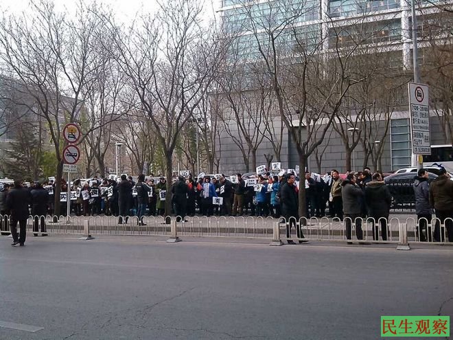 民生观察工作室2013-12-27消息:今天上午,工商银行总行东门前又聚集了大批下岗职工在这里请愿抗议。据现场李先生向本工作室介绍,现场的职工有五百人左右,这些职工来自工商银行、建设银行、中国银行、农业银行。大家在这里手挽手、肩并肩,打出统一的冤字标语,并高呼口号。