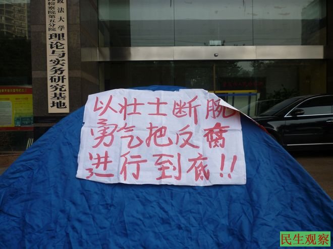 民生观察工作室2014-1-21消息:2014 1月20日,重庆市两会期间,永川市民袁影在重庆市检察院第五分院搭帐篷举报重庆市江津区公房管理所非法进行房地产开发,所有资金未纳入国家财政。永川市民袁影表示,要按照习近平总书记的讲话精神去做:“以状士断腕勇气把反腐进行到底”。绝不让国有资产流失。
