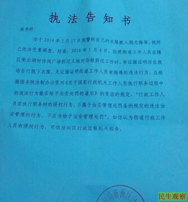 武汉周秀芝就强拆被脱光衣服诉公安不获受理